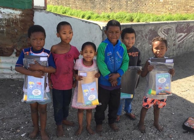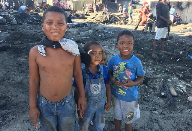 Over the weekend a number of our school families were affected by shack fires in the Hadji Ebrahim settlement. While their shack was burning down Lameck (far right) begged his mom to save his school bag which contained his message book and Grade R registration forms. Thankfully she was able to and he was at school today. He was really feeling down though because he had to borrow shoes from another boy at school. Fortunately there was a pair for him in our cupboard of emergency clothing and he happily joined the others on their outing to the park.