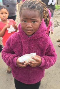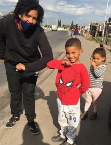 Diego, who graduated at the end of 2019 was thrilled to see teacher Nushfeekah again and greeted her with an elbow tap! Behind him is his sister Mia who started at Children of Light this year. They live in Pook se Bos.